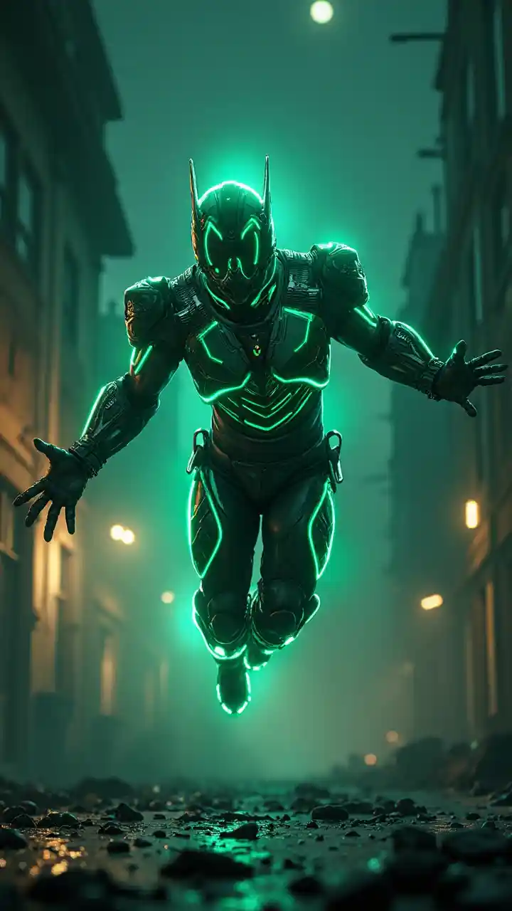 ((Représentant: 1,2), (Meilleure qualité, ultra-détaillé, réaliste: 1,37) Haute qualité, haute définition, ultra-détaillé, Unreal Engine, photos primées, photographie ultra-réaliste, 3D, 8k, éclairage de cinéma, éclairage de volume, éclairage à bord dur, photographie ultra-réaliste, HDR, volume, dans un chef-d'œuvre cinématographique, un chevalier masqué néon vert s'est envolé à travers l'usine abandonnée, baignant dans une lumière volumétrique avec une résolution simulée de 64k. Les lumières dynamiques mettent en lumière des subtilités de détails sur sa tenue, avec des scènes sur fond d'usines abandonnées la nuit. À chaque courbe et grattage, la caméra d'action du chevalier masqué défie la gravité, et l'environnement environnant semble se déformer autour de lui, comme si la réalité elle-même était manipulée. Cette image époustouflante est une œuvre d'art originale qui redéfinit les limites du récit visuel et prouve le summum de l'excellence artistique., Mecha, mechanx