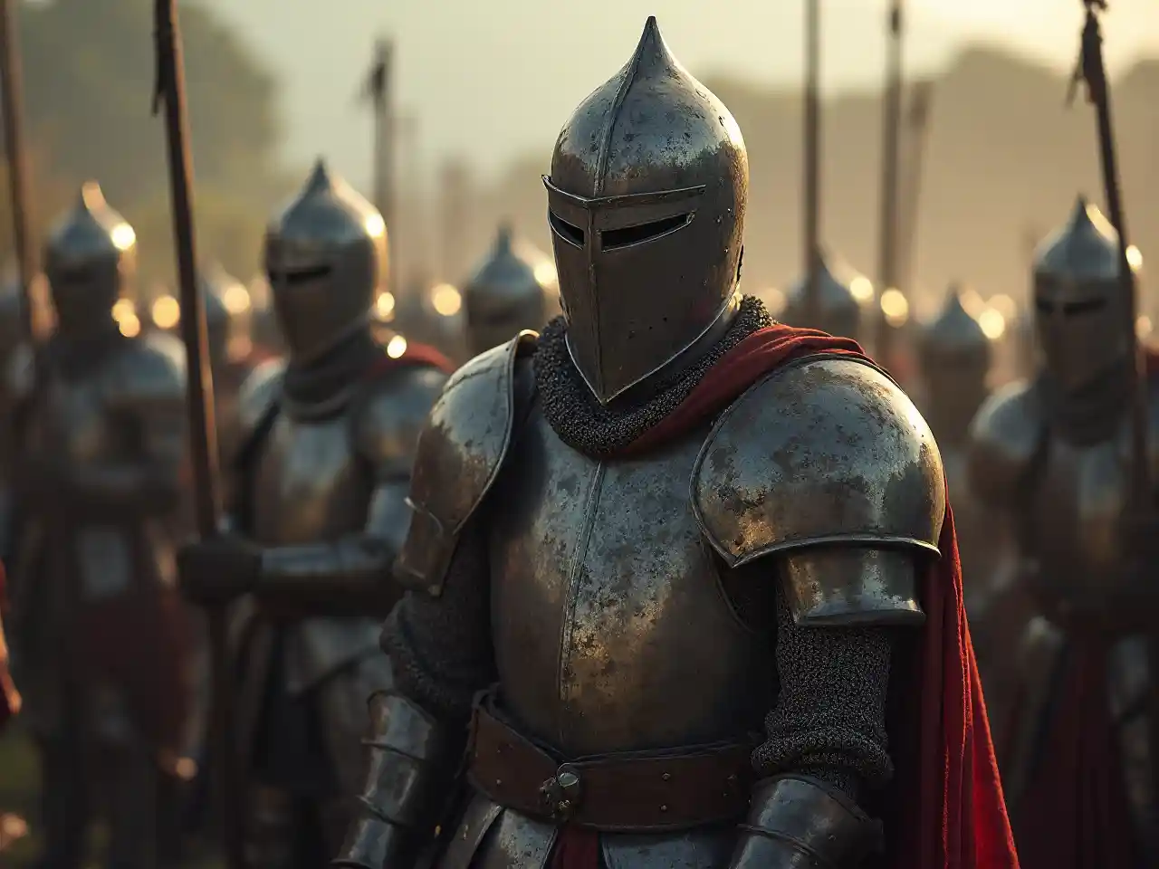 Chevalier médiéval, armure de fer, après-guerre, portrait épique