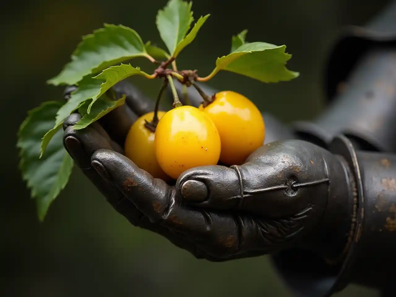 SawyerDes gants médiévaux chevaliers armés de branches de prune jaune de Mirabel. Les gants en métal sont finement décorés.