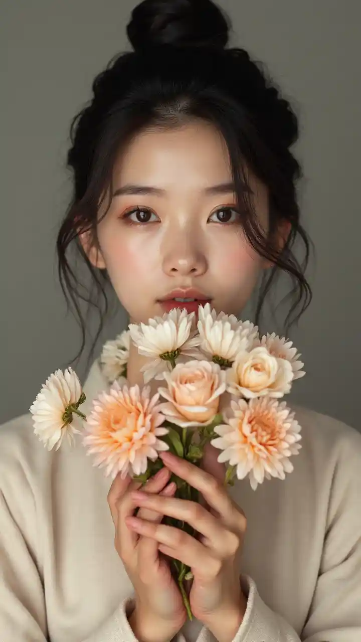 ColtenBeauté asiatique tenant des fleurs, modèle coréen, style photo réel, gros plan sur le visage, photographie Kodak