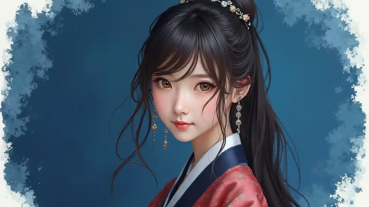 Une jeune femme coréenne de 18 ans, aux yeux joyeux et souriants, aux yeux marron chauds, aux lumières traditionnelles douces, aux cheveux châtains longs attachés en queue de cheval et aux ornements de cheveux délicats, voici la photo en gros plan d'une jeune femme asiatique dont les cheveux sont longs et noirs, légèrement salissants, couvrant partiellement son visage. Elle a la peau claire et regarde directement la caméra avec un regard contemplatif, ses lèvres légèrement ouvertes. Ses yeux sont marron foncé, ce qui augmente l'intensité de son regard. Hanbok (Deep _ Black _ Cobalt _ Silver _ Gold _ Red), haut du corps, libre _ posture. Tourner les épaules. L'arrière-plan est un bleu cobalt profond de style aquarelle et charbon de bois, avec un lavage riche et abstrait et une texture expressive, qui ajoute de la profondeur et une sérénité sacrée, et ne détournera pas l'attention du sujet. L'arrière-plan est dessiné dans un style de pinceau, avec des textures de pinceau visibles et expressives et des coups de pinceau dynamiques, ajoutant de la profondeur et du mouvement. Le pigment ne couvre que la zone juste derrière le corps principal, laissant le bord extérieur de l'image avec des bords blancs nets, comme si l'arrière-plan était brossé derrière elle et s'estompait vers le cadre, créant un effet d'épisode moderne et artistique.
