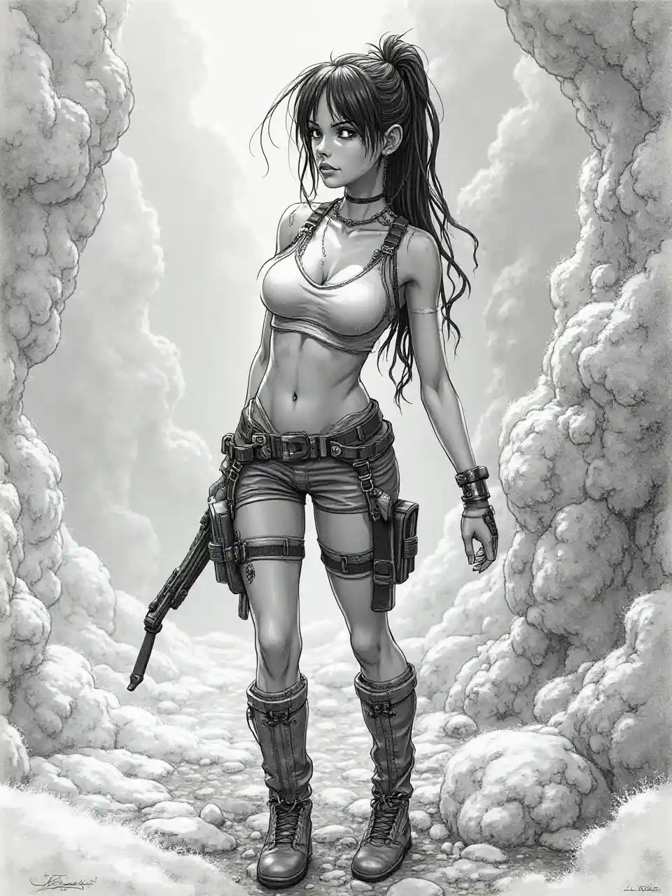 La représentation du corps entier de Lara Croft est inspirée de la bande dessinée, dans le style de la bande dessinée, présentée au crayon noir et blanc, avec des détails complexes, et est populaire sur les plateformes artistiques. Les scènes sont filmées et méticuleusement conçues, et l'environnement époustouflant est capturé avec un art de ligne mémorable, qui rappelle la photographie primée. Cette œuvre d'art combine des textures brillantes et lisses pour créer une atmosphère surréaliste et sacrée avec des éléments d'élégance céleste. Rendue dans un style qui s'apparente à une peinture à l'huile des Beaux-Arts ou du CGI officiel, elle dégage une touche de douceur et de charme. Ce personnage a l'air vivant, se concentrant sur l'anatomie des détails, évitant toute déformation, ce qui lui permet de mélanger de manière transparente les traits de poupée 3D et le rendu d'octane poli.
