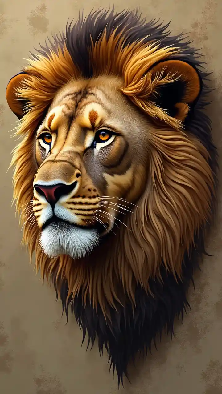 Type d 'image: Photographie (((description du thème: mur de la réalité)) Illustration numérique réaliste d'un lion au visage humain en Afrique, représentée d 'une manière stylisée et inspirée par l'art tribal pour représenter le lion et sa signification en Afrique.
