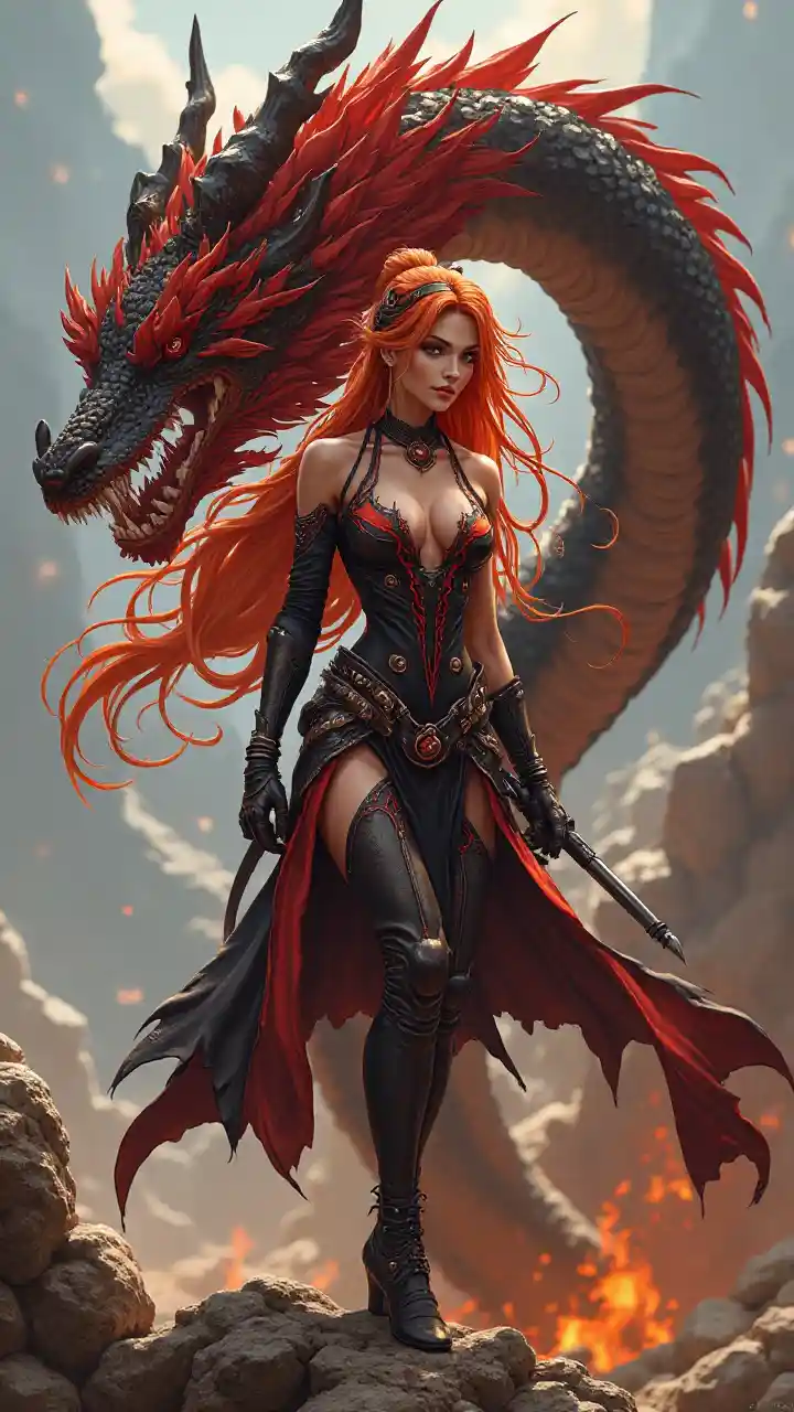 L'art de Louis Royo présente des personnages féminins majestueux et intimidants, dominant la scène avec une aura puissante et élégante. Ce personnage animé est droit et imposant, et son physique musclé respire la force et la confiance. Les cheveux longs et élégants ajoutent à son sens du mystère, et le rouge foncé volcanique ressemblant à une cascade se déverse dans son dos, renforçant sa présence majestueuse. Le costume futuriste qu'elle porte est à la fois exposé et protecteur, incarnant une esthétique moderne qui mélange la mode traditionnelle japonaise et les marges futuristes. Le dragon qu'elle dirige est une créature magnifique, dont les dessins rouge flamboyant et noir complètent son costume opulent, soulignant sa beauté naturelle. Ce tableau, qui capte un moment épique de grandeur, montre le cliché en plein corps de ce redoutable guerrier dans un paysage qui fait écho au style enflammé et dynamique de l'univers fantastique de Louis Royo