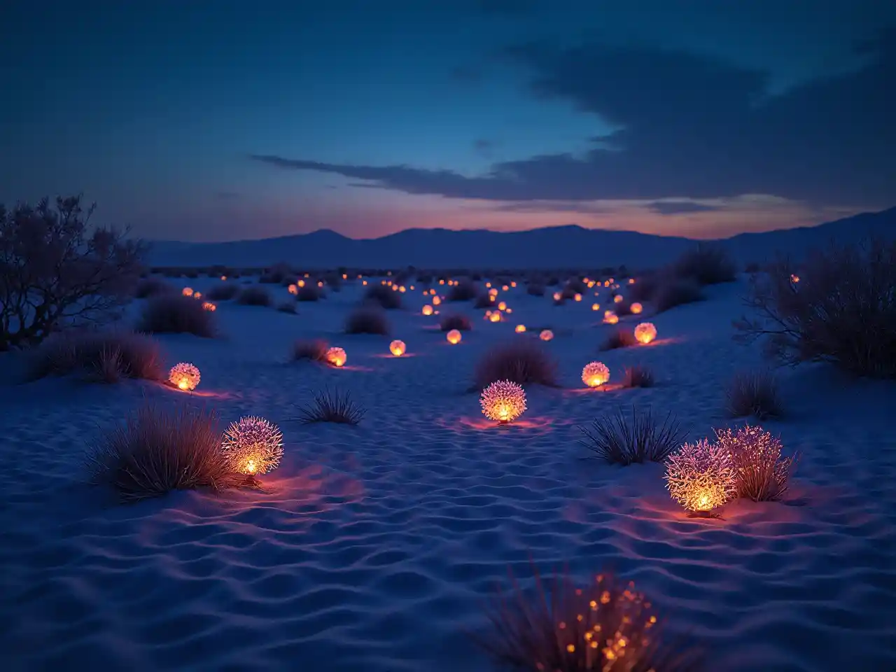 Créez un désert étrange au crépuscule, où le sable est illuminé par la douce lumière des plantes phosphorescentes, projetant l'ensemble du paysage dans une série de couleurs surréalistes et charmantes.