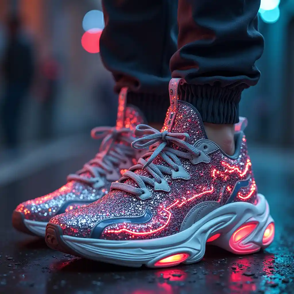 La mode Gucci, parsemée de pierres précieuses, s'accompagne de lignes lumineuses et de paillettes. Sport high-tech à l'image ultra-réaliste Baskets moelleuses à la mode moderne, ambiance profonde, saturée, énergique et pointue dans les détails
