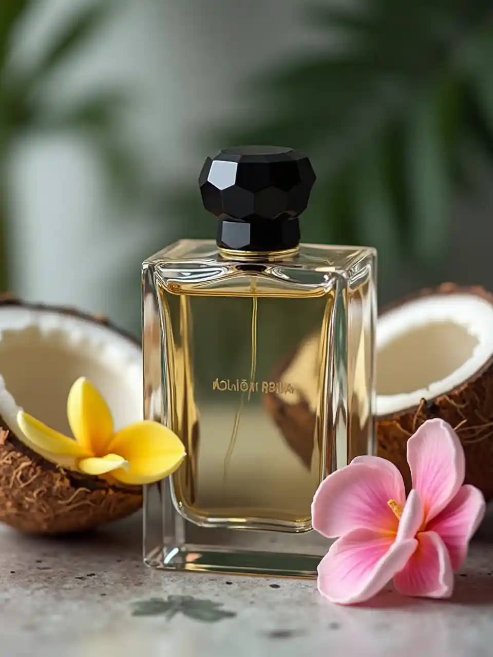 MaverickProfessionnel de la photographie Un parfum de luxe, un flacon carré, une pierre noire gravée en forme de couvercle, entouré de noix de coco et de fleurs, sans étiquette, clair, maquette