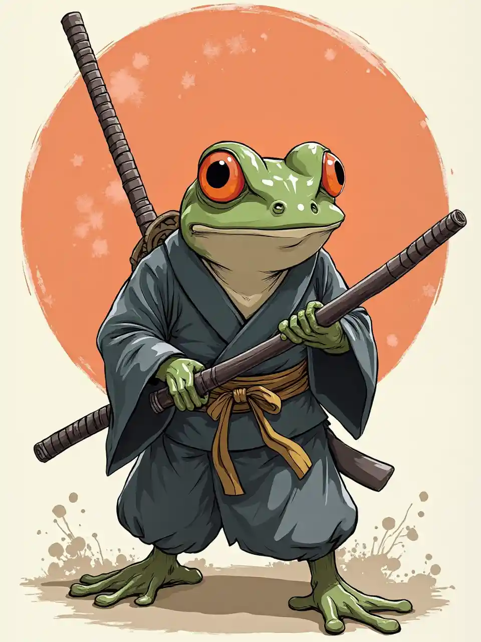 Manga frog wielding a Katana and wearing a minimalist kimono
