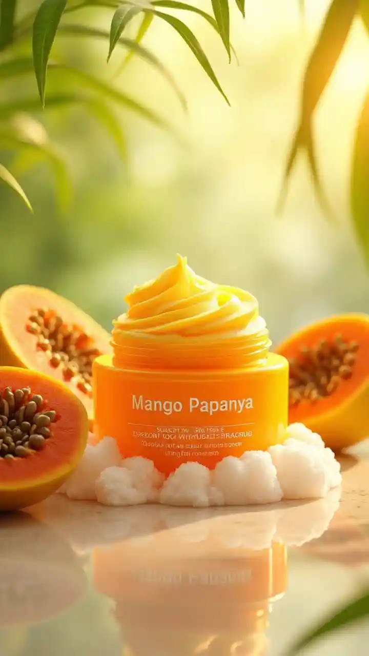 De luxueuses boîtes de gomme moussé, des tourbillons orange et jaune vibrants, étiquetés « mangue papaye », entourés d'éléments tropicaux. Ajoutez la mangue luxuriante et le fruit de papaye pour couper les détails juteux, la mousse blanche moelleuse déborde doucement autour du pot, les feuilles de palmier vert tropical sont à l'arrière-plan et le soleil doré doux traverse. La surface réfléchit, créant une beauté polie et propre, avec un éclairage de bokeye subtil, créant une apparence rêveuse et luxueuse. Super réaliste, coloré, publicité parfaite pour les produits de beauté