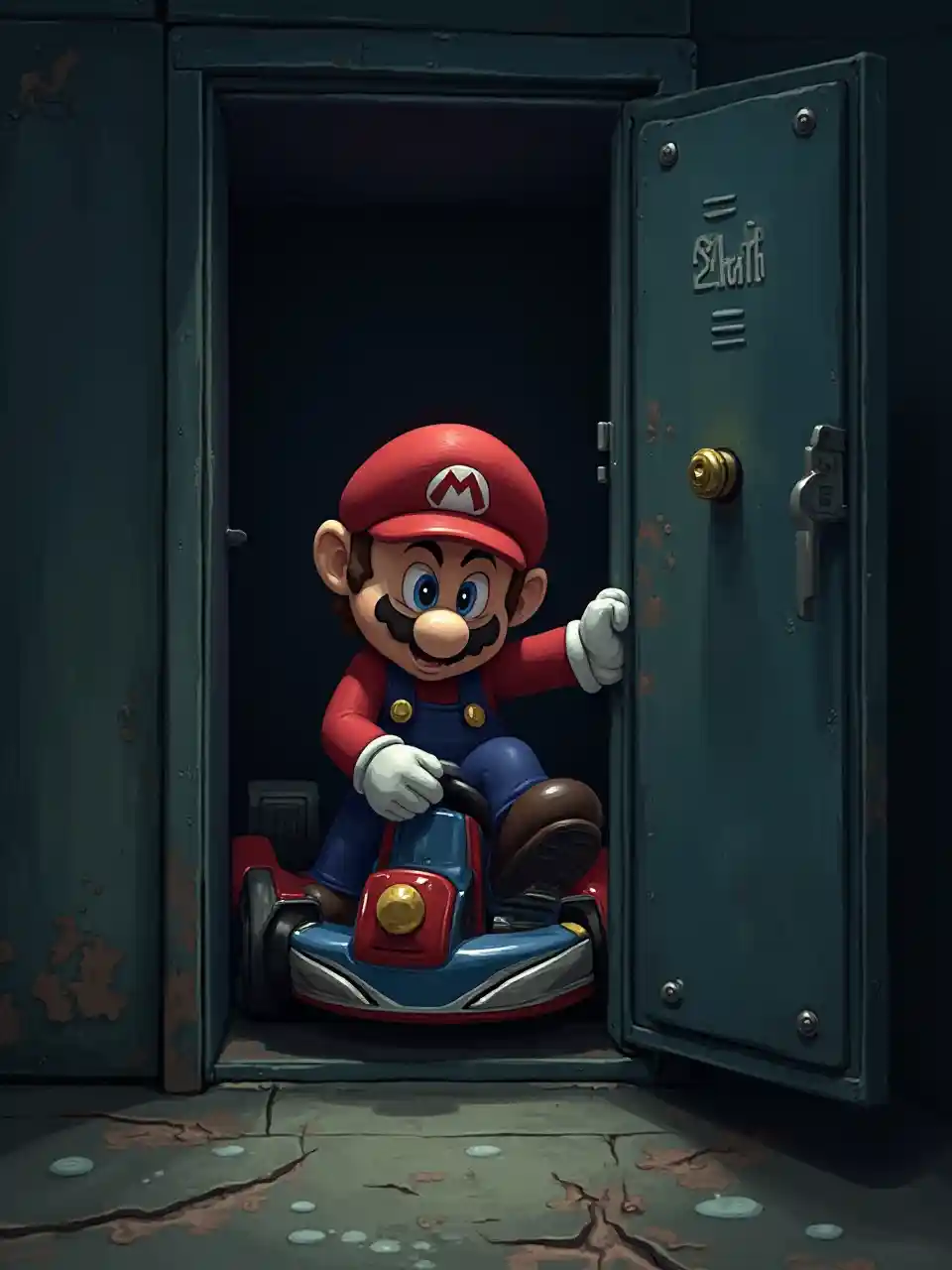 JocelynÀ l'intérieur, la perspective est un casier sombre. Mario au volant d'un kart Mario était coincé dans un casier sombre. Il était triste et a regardé le sol et a pleuré → Délicieux