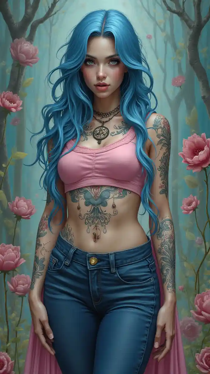 Le chef-d'œuvre de Mark Ryden, la peinture numérique (((corps entier)) met en scène des femmes aux cheveux bleus de style gothique, sexy et courbes, vêtues d'un jean moulant lisse et d'un haut rose élégant, décoré d'un sophistiqué et complexe (((tatouage gothique)), dégageant une lumière douce et une aura fantaisiste. Sa peau blanche et pâle, ses cheveux longs et élégants, se complètent avec une atmosphère éthérée. L'arrière-plan est une scène colorée, légèrement exagérée et surréaliste qui renforce l'impression d'un royaume fantastique