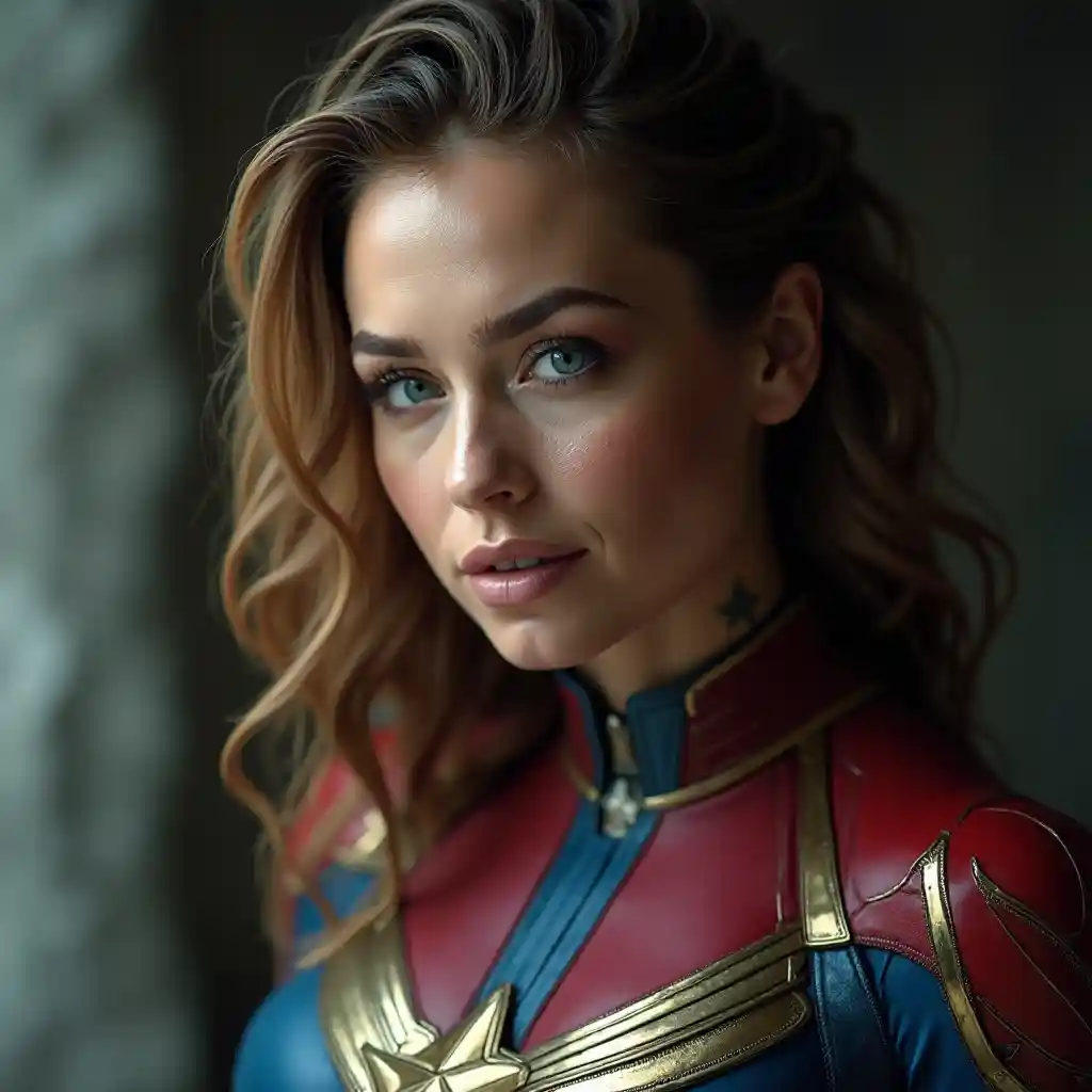 Une femme vêtue d'une tenue complexe sur le thème du métal, habillée en capitaine Marvel et parsemée de tatouages, a regardé avec confiance le public dans ce portrait photographique époustouflant. Sa peau, captée avec un réalisme et des détails exceptionnels, affiche des qualités hautement méticuleuses et réalistes en résolution 8k. La monture en pleine longueur met en lumière la subtilité de sa tenue. L'image a une beauté ultra-réaliste, améliorée par un éclairage diffus et doux et une faible profondeur de champ pour une mise au point nette. L'éclairage du cinéma améliore l'expérience visuelle et crée une atmosphère immersive. Les photos contiennent des détails élevés et des couleurs riches, évitant les défauts tels que le flou, l'artisanat ou la mauvaise qualité. La composition évite les éléments superflus, maintient une structure anatomique proportionnelle et réaliste, assurant une image finale charmante et polie.