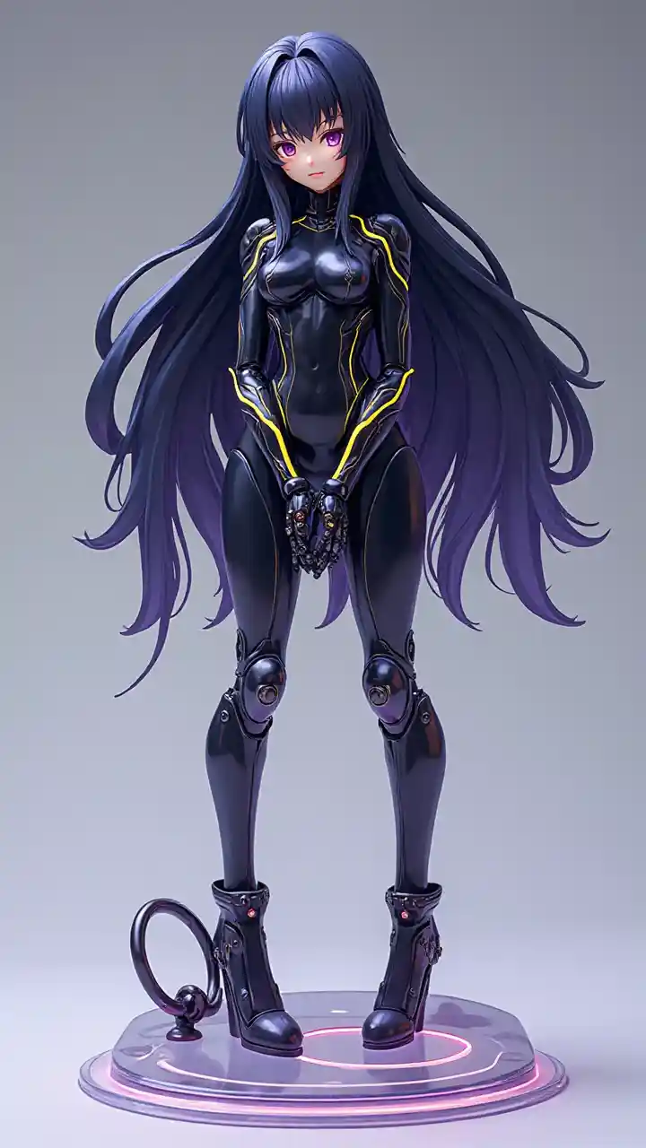 Une fille en mecha futuriste de style animé de haute qualité, vêtue d'une armure high-tech élégante. Cette silhouette a de longs cheveux noirs fluides et un lustre métallique. Elle pendait le long de son dos. Son corps était enveloppé dans un manteau mince, brillant, sombre et violet, soulignant son aspect futuriste. Elle prend une posture légèrement penchée vers l'avant, les mains jointes, dégageant grâce et force. Sa robe a un design exquis, avec des lignes jaunes fluo lumineuses qui coulent sur son corps, dégageant une atmosphère rock et cybernétique. Ses jambes portent des planches blindées ajustées, soulignant sa silhouette élégante, et les articulations mécaniques et les détails du robot peuvent être vus aux genoux et aux chevilles. Elle se dresse sur une base claire et minimaliste avec des éléments instrumentaux qui créent des sensations vibrantes. Le design consiste à intégrer subtilement du rock dans son socle, ses postures et ses expressions se mêlent à la musique. Style de dessin animé, vue de l'avant