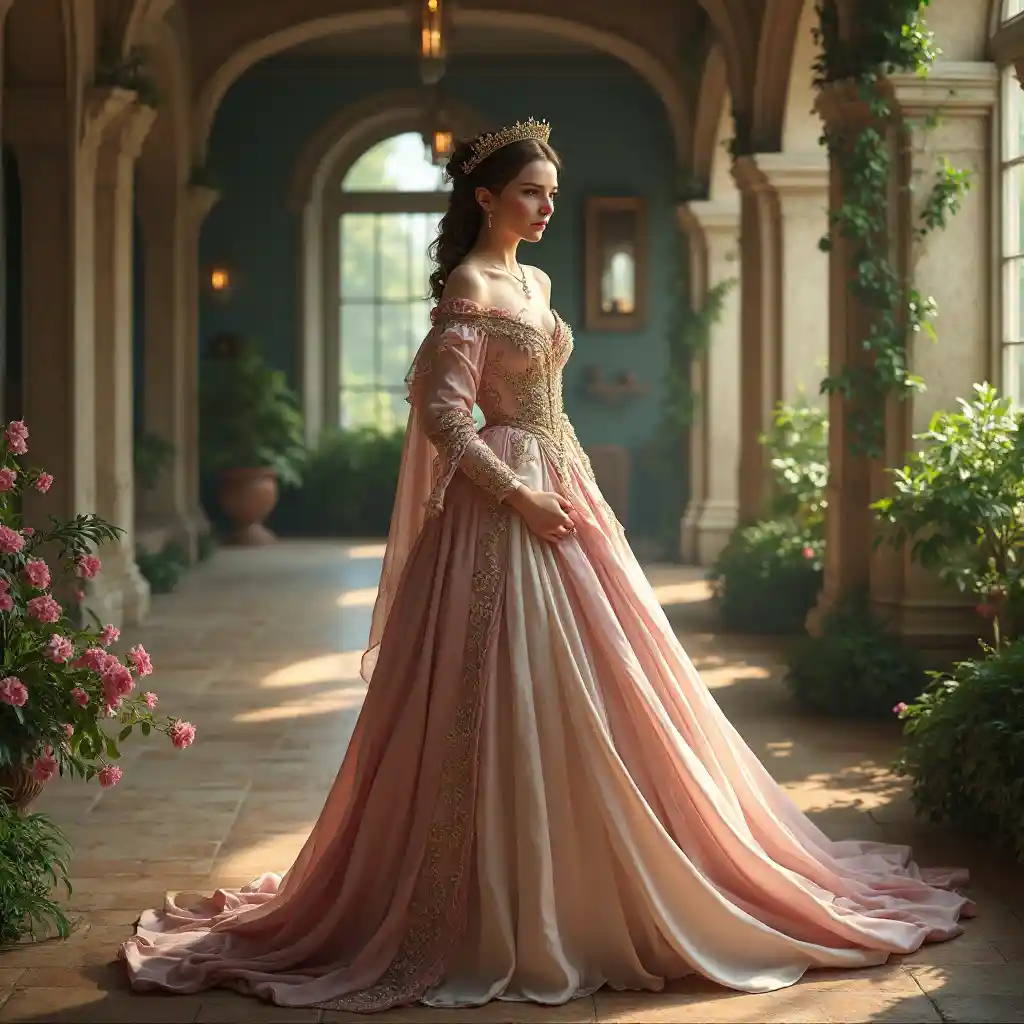 Art numérique hautement détaillé @ zQOVLKPVAQZCrPYVLTLK Vêtu d'une robe de soie en satin fluide, d'une salle de danse de château médiéval, de style Anton Pick, de fantaisie médiévale, de motifs complexes, de tissus magnifiques, de robes royales, de plis de vêtements réalistes dans les détails, d'une verdure luxuriante, de tons doux et doux, d'un éclairage romantique, d'une robe professionnelle, ultra-détaillée, fantaisiste, médiévale, d'une robe en satin, d'un jardin de cour, de style Anton Pick Architecture magnifique, verdure luxuriante, éclairage romantique, robe royale, motifs complexes, tonalités pastel douces, tissus élégants, éclairage professionnel
