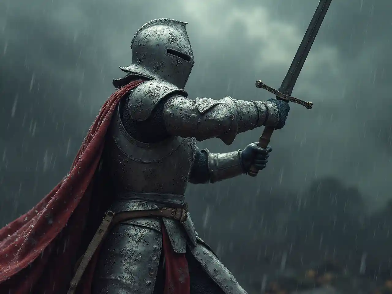 Un chevalier médiéval vêtu d'un magnifique gilet pare-balles complet, brandissant une longue épée étincelante avec une précision d'expert, se déroulant sur un fond dramatique et orageux; une représentation très réaliste et ultra-détaillée capte le chevalier dans le pendule central, dont la cape roule dans le vent et brille sur une armure mal sculptée comme une goutte de pluie, évoquant un sens éternel du courage et de la force dans le ciel turbulent.