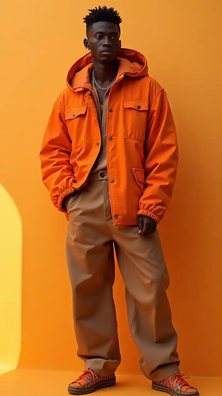 MackenzieD í seno dije para hombre minimalista monocrom á tico de acr í lico naranja peque ñ o y sutil inspirado en el trabajo de Virgil Abloh。 Colocados sobre un hombre