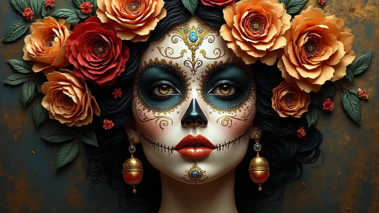 KinsleyVisage mexicain, Caravira, ornemental, fleur, or et noir, art surréaliste de style 3D, peinture, visage de fille, glamour