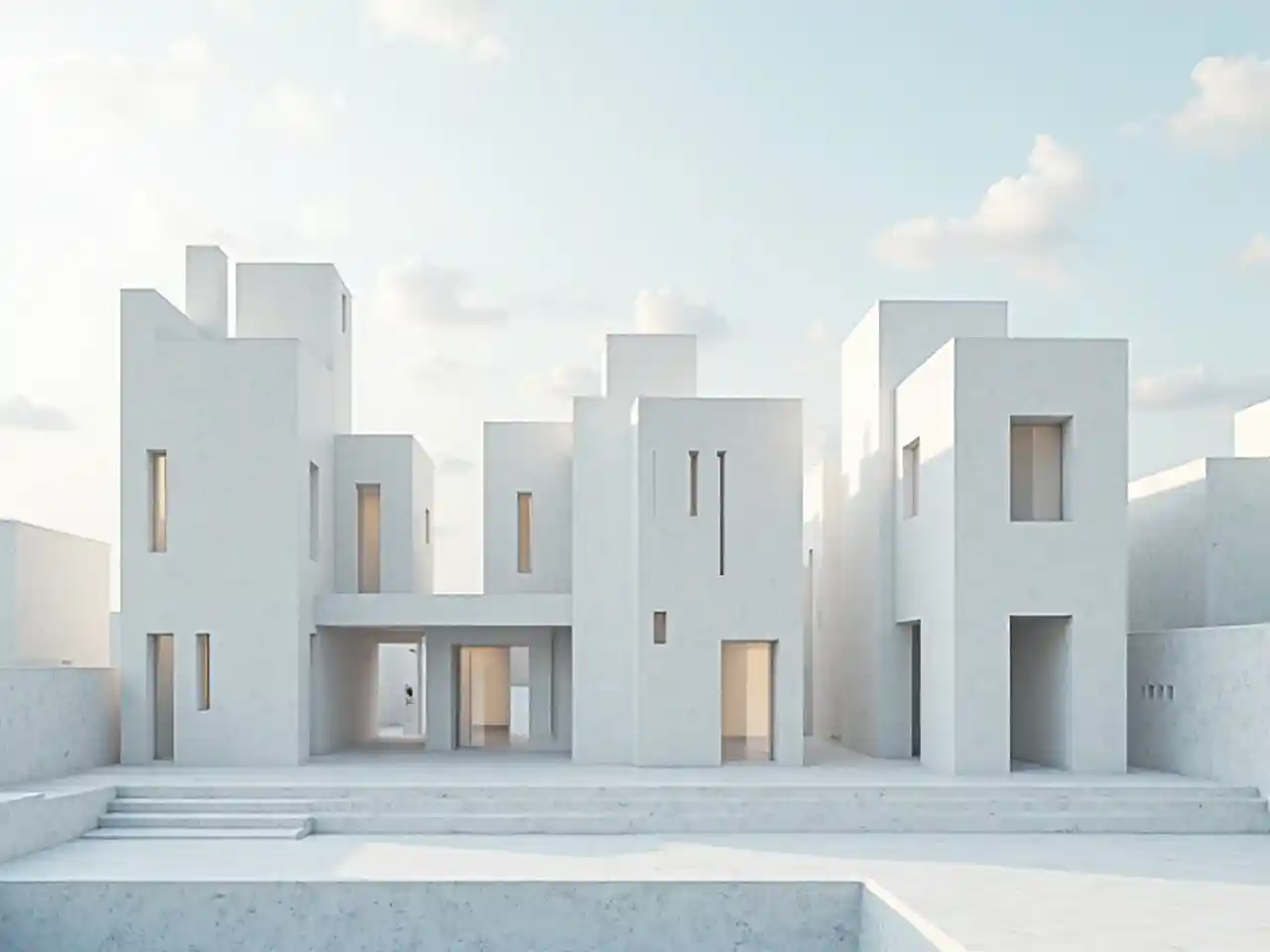 Donnez-moi un exemple, le bâtiment blanc simple assure la connexion, libère de l'espace pour mettre une simple porte et fenêtre simple, rappelez-vous que ces bâtiments sont à usage résidentiel, ajoutez une entrée avec escalier et augmentez le nombre d'étages à 6 étages, fusionnez le nombre de bâtiments à 4 étages et donnez-moi un dessin montrant l'ensemble du bâtiment ensemble