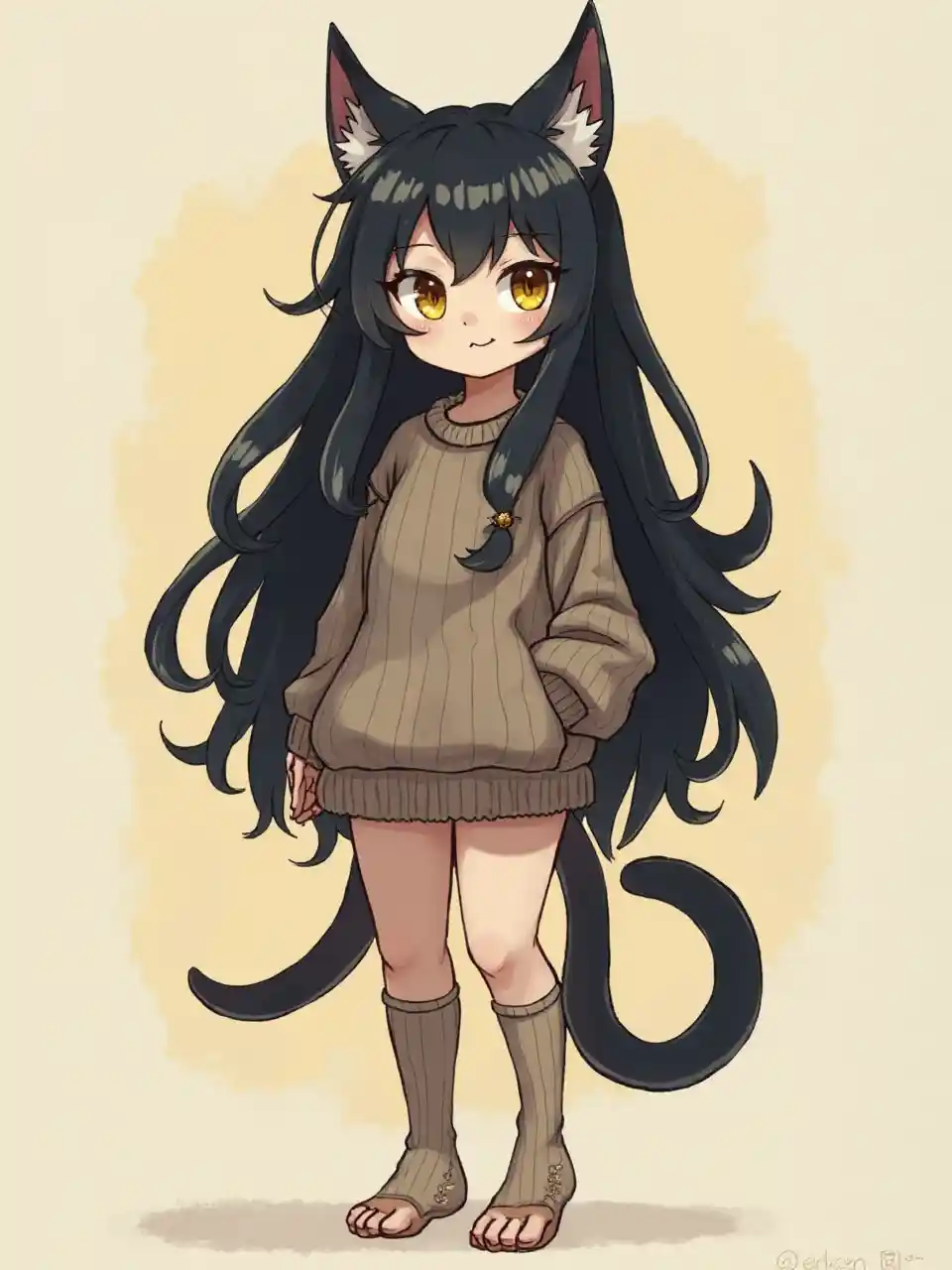 Miri est une petite fille chatte, debout sur environ 5 pieds et 2 pouces, élégante et agile, se déplaçant comme un félin - calme, fluide et toujours concentré. Sa peau est douce et pâle, avec la lumière d'un léger baiser solaire. Ses cheveux longs et élégants correspondent à sa vieille fourrure: des rayures noires et argentées délicates capturant la lumière, se déversant vers le bas le long de son dos dans une forme de vague soyeuse. Au-dessus de la tête, deux oreilles de chat noir velouté, expressives, toujours convulsives par l'émotion. Ses grands yeux dorés brillent de sagesse et de malice, avec des pupilles étroites qui se déplacent avec la lumière. Son visage est jeune et beau, son petit nez renversé, ses dents délicates et pointues révélées par un sourire et son visage est un sourire ludique et idiot qui se décolore rarement. Une queue noire lisse se prolonge derrière elle, se balançant presque toujours dans son humeur. Elle porte des vêtements à la fois confortables et à la mode, généralement un pull surdimensionné qui tombe d'une épaule, avec des chaussettes jusqu'aux jambes ou des leggings souples. Elle est généralement pieds nus, préférant être directement attachée au sol, bien qu'elle porte occasionnellement des chaussons à griffes. Parmi ses accessoires figurent des bibelots brillants - perles de verre, pin's, ou encore des ornements qu'elle a "empruntés". Le total look de Miri capte sa double nature: mystérieuse, attachante et charmante à parts égales. Elle est indéniablement féline, même avec sa forme humaine - charmante, curieuse, impossible de passer inaperçue.
