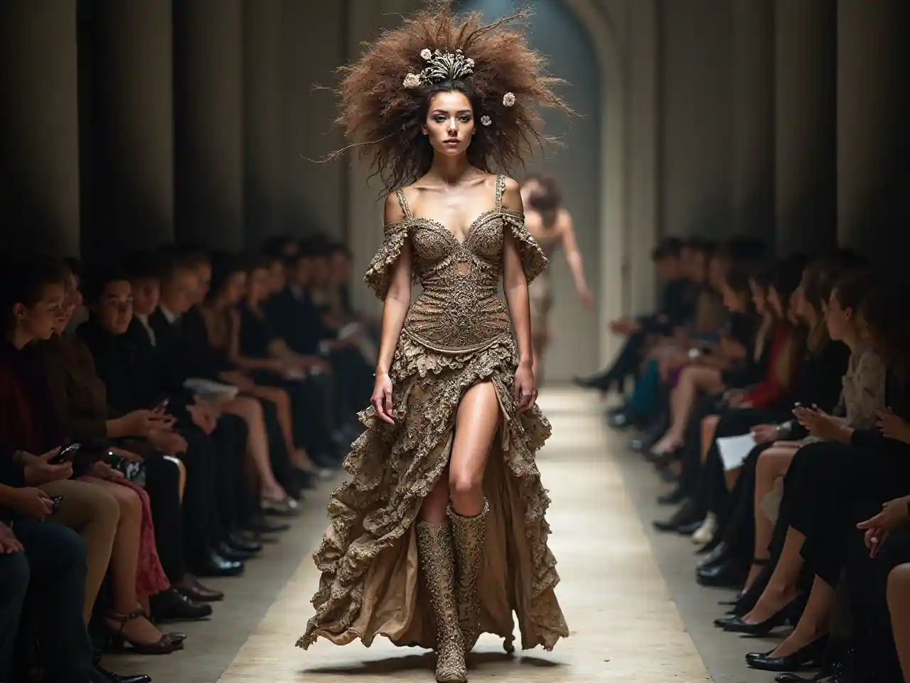 Les mannequins de mode se promènent sur le podium, les robes élaborées par Alexander McQueen, les visages méticuleux, les beaux visages féminins, les œuvres d'art de Julia Herta et Gian Paul Scula, Pamela Hansen, David Romer, Mario Testino, Lara Jade, Tim Walker et Cole Spruce