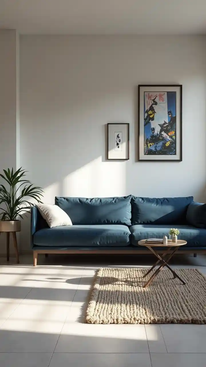 Une photo d'un salon contemporain à l'aube montre un sol en carrelage lisse et poli, rehaussé d'un tapis texturé qui ajoute de la chaleur. Le noyau est un ensemble de canapés bleu foncé contemporains, complétés par des tables latérales en bois élégantes. Une charmante trame artistique d'illustration de Batman est accrochée au mur, qui insuffle une touche de personnalité à la pièce. La lumière naturelle inonde l'espace, mettant en avant les lignes épurées et l'esthétique minimaliste de la pièce en ultra haute définition. Les modifications subtiles incluent des coussins en peluche douce sur le canapé et de petites plantes en pot sur la table latérale, ajoutant une touche de fraîcheur naturelle.