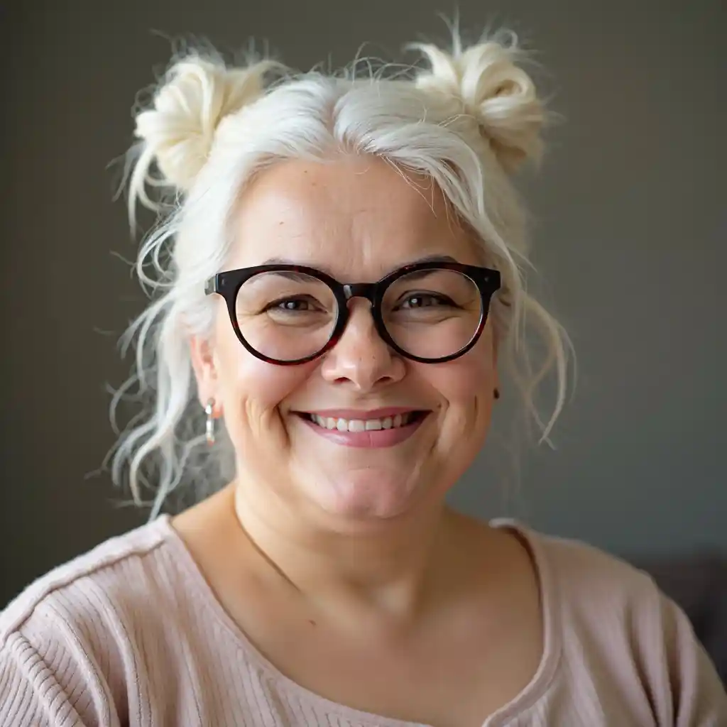 JackLa grosse mère souriante avec des lunettes rondes a les cheveux gris et les cheveux attachés comme des petits pains cuits à la vapeur
