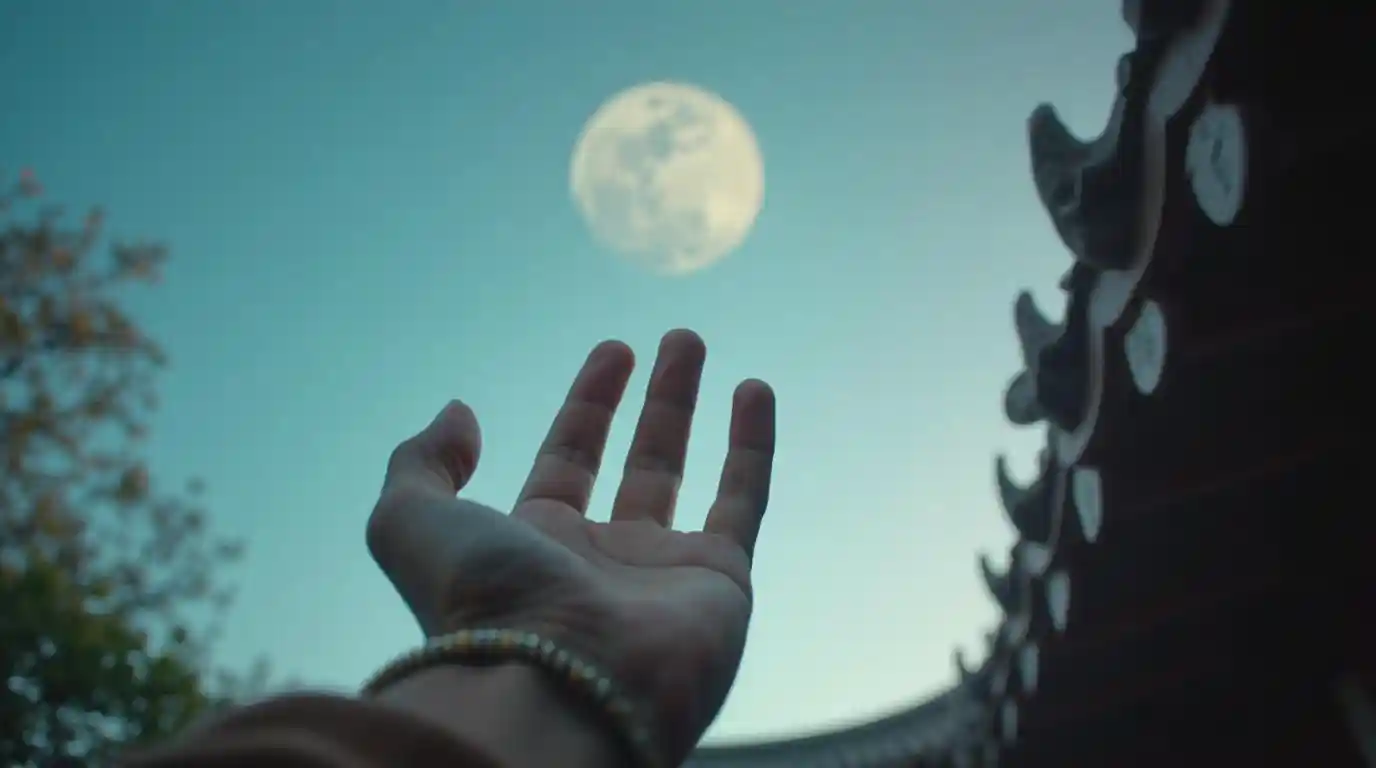 Du point de vue à la première personne, le bord du toit chinois traditionnel s'étend au champ de vision, et la moitié de la lune cirée s'attarde dans le ciel matinal doux. La main d 'une femme s'ouvrit grossièrement vers la lune, comme si elle essayait de l 'attraper.
