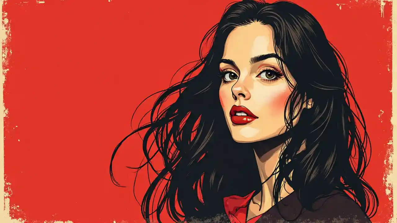 La gentille et belle maman a les cheveux longs, et les peintures et illustrations accrocheuses de style affiche sur fond rouge représentent le style emblématique de la pulpe.