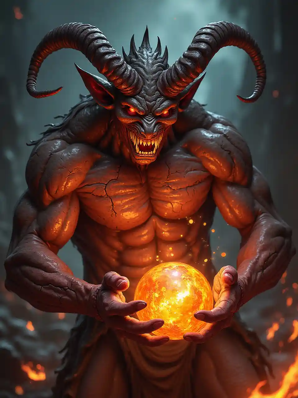 Créer l'image d'un démon musclé, avec des cornes massives et courbes et des yeux féroces et lumineux. Le démon aurait dû craquer, avec une peau de lave, qui dégage une lumière de feu. Il se transforme en une sphère lumineuse, incandescente, avec la main de sa patte. Y compris des textures détaillées telles que des écailles et des fissures en fusion sur son corps, et assurez-vous que son expression est menaçante. Le fond est censé suggérer un environnement sombre, infernal, avec une pointe de fumée, d'éléments enflammés.