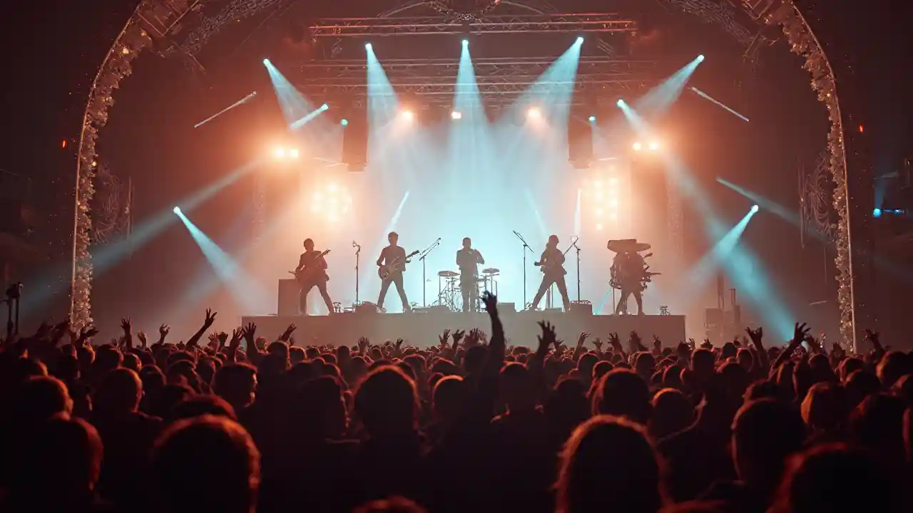De grands concerts aux lumières éclatantes, enjambant la scène, créant un spectacle fascinant. Face à un vaste fond éclairé, le spectateur est baigné d'une lumière chaleureuse, magique. La décoration scénique est festive et les équipements sont assortis pour rehausser l'ambiance festive. Les musiciens, en tenue professionnelle, dégagent un air de joie et d'excitation. Cette image saisit le cœur d'un événement musical réunissant des éléments de fête vibrants et la magie d'une expérience musicale en direct