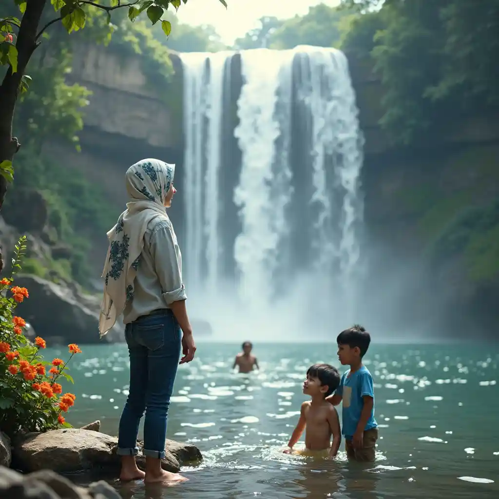 Générez une très belle photo de côté avec les yeux bleus musulmans et le turban blanc avec des arbres, un jean bleu, debout près d'une belle cascade, souriant et parlant à un jeune homme, regardant la cascade, entouré de fleurs et d'arbres. Quelques petits garçons nageaient