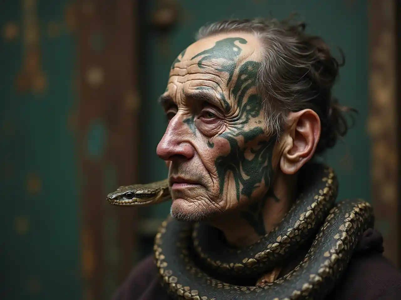 Une vieille femme vaudou avec un tatouage du visage et un serpent au cou