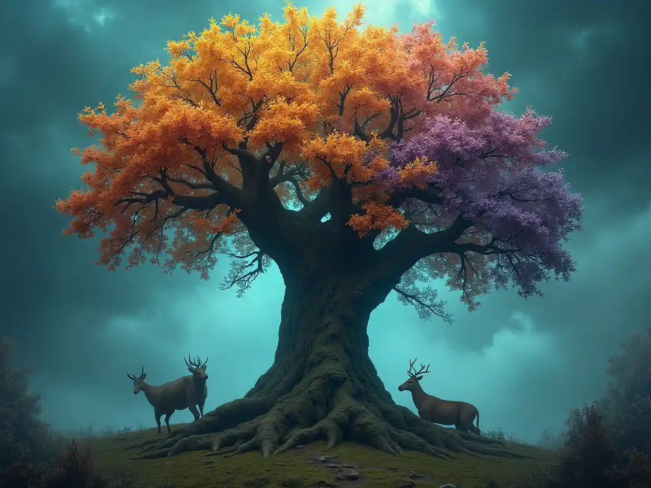 Arbre magique aux feuilles multicolores, tronc épais de différents animaux, ambiance mystique fokrug, magie