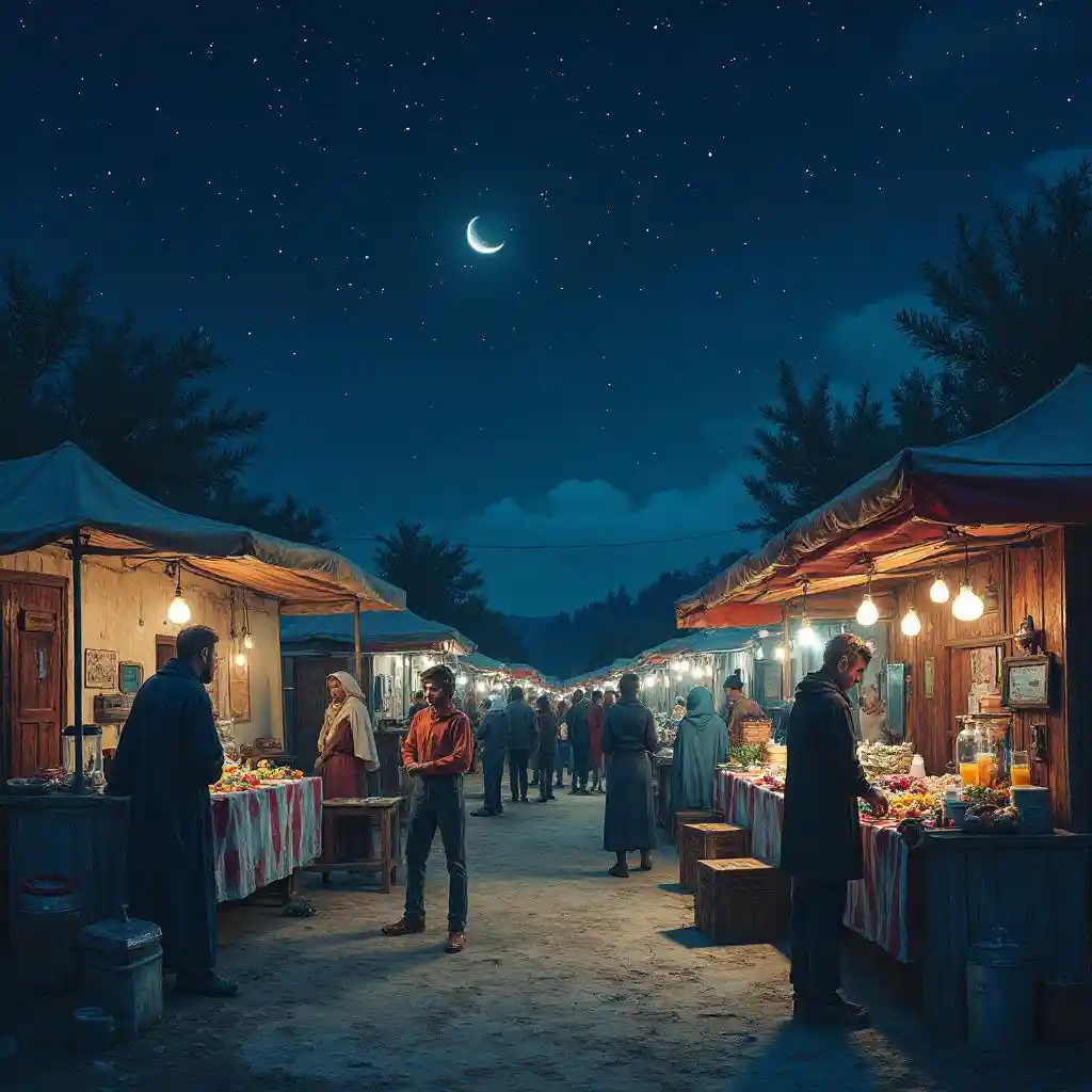 Au marché nocturne sous le ciel étoilé, les fantômes vendent des marchandises, résonnant dans une atmosphère de transe.