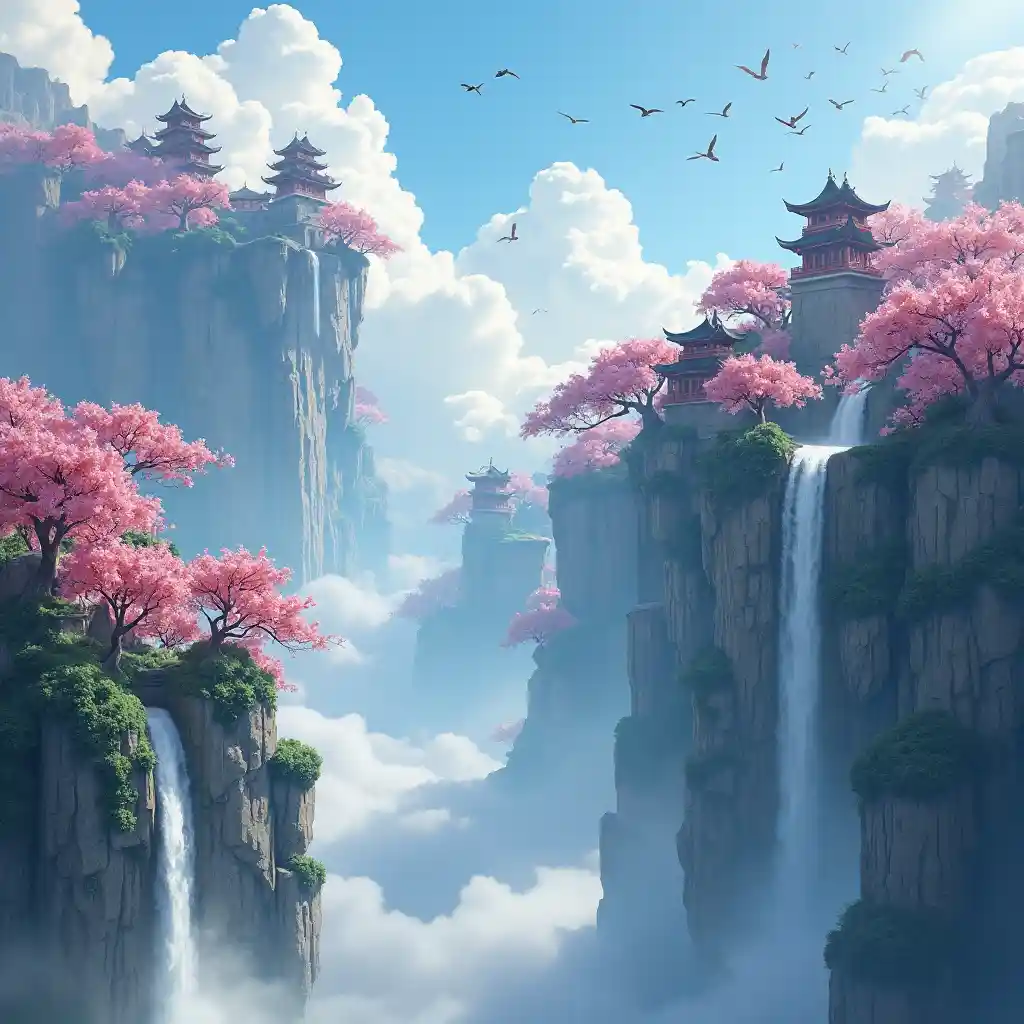 Ce paysage fantastique évoque la fabuleuse esthétique chinoise et montre la scène palpitante d'une île flottante. Les bâtiments traditionnels de style est-asiatique avec de magnifiques toits habitent précairement sur les terres hautes et épaisses de nos jours, entourés de cerisiers en fleurs florissants, et leurs feuilles roses ajoutent des éclats de couleur. D'innombrables cascades se déversent du bord de ces îles surélevées et disparaissent dans les profondeurs brumeuses en dessous, créant une sensation de hauteur et de grandeur. Des nuages moelleux, blancs et bleus, flottent sur la scène, obscurcissant en partie la partie basse de la falaise, ajoutant un air éthéré. Un groupe d'oiseaux noirs s'envole dans le ciel, renforçant encore la large hauteur et le sentiment de liberté. L'ensemble donne l'impression d'une majesté sereine, d'un royaume céleste que le monde ordinaire n'a jamais touché.