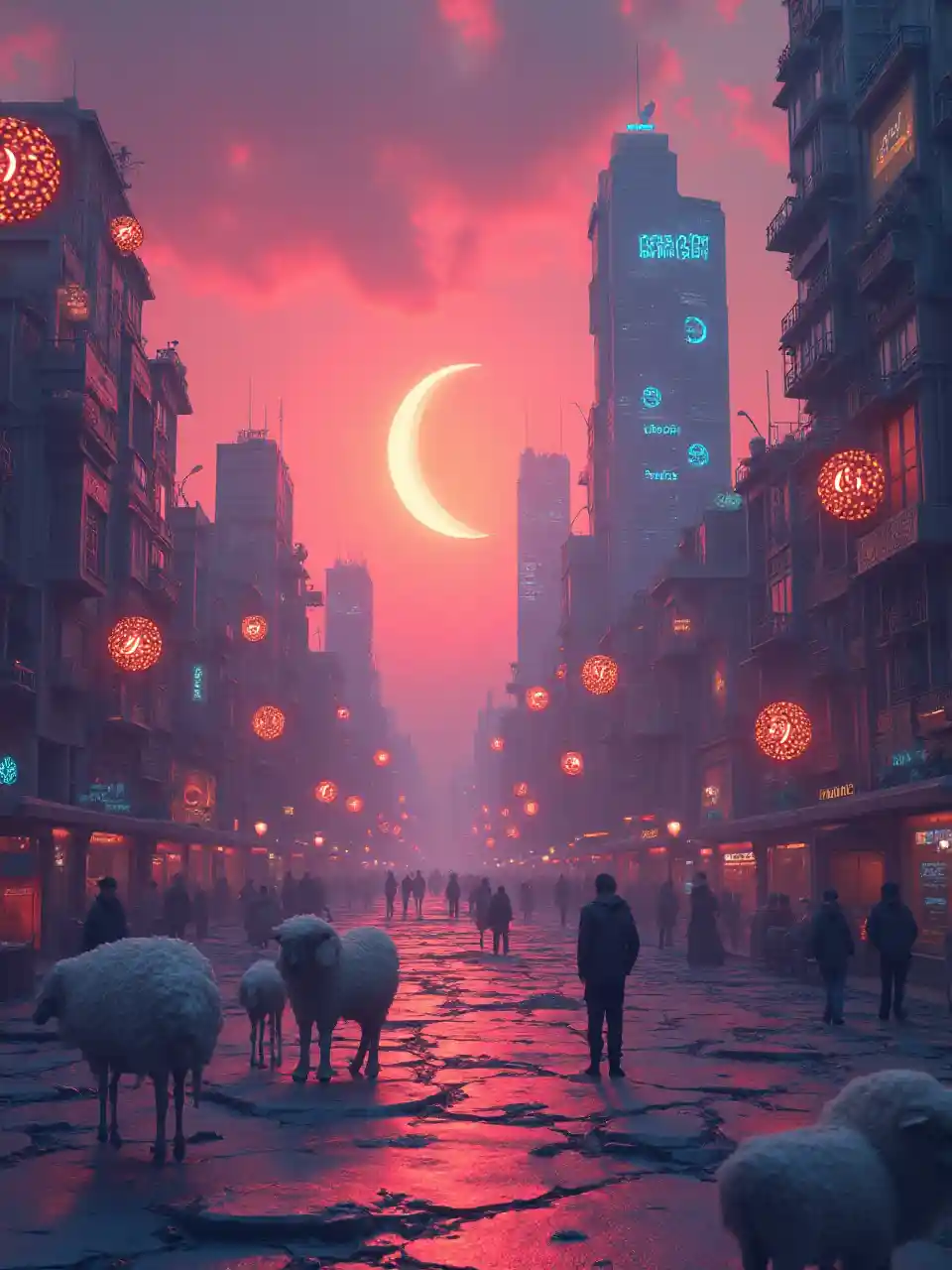 Une ville futuriste au néon surréaliste au coucher du soleil, flottant avec des moutons lumineux, un croissant de lune, des biscuits, des mots arabes et des gens sur le sol réfléchissant.