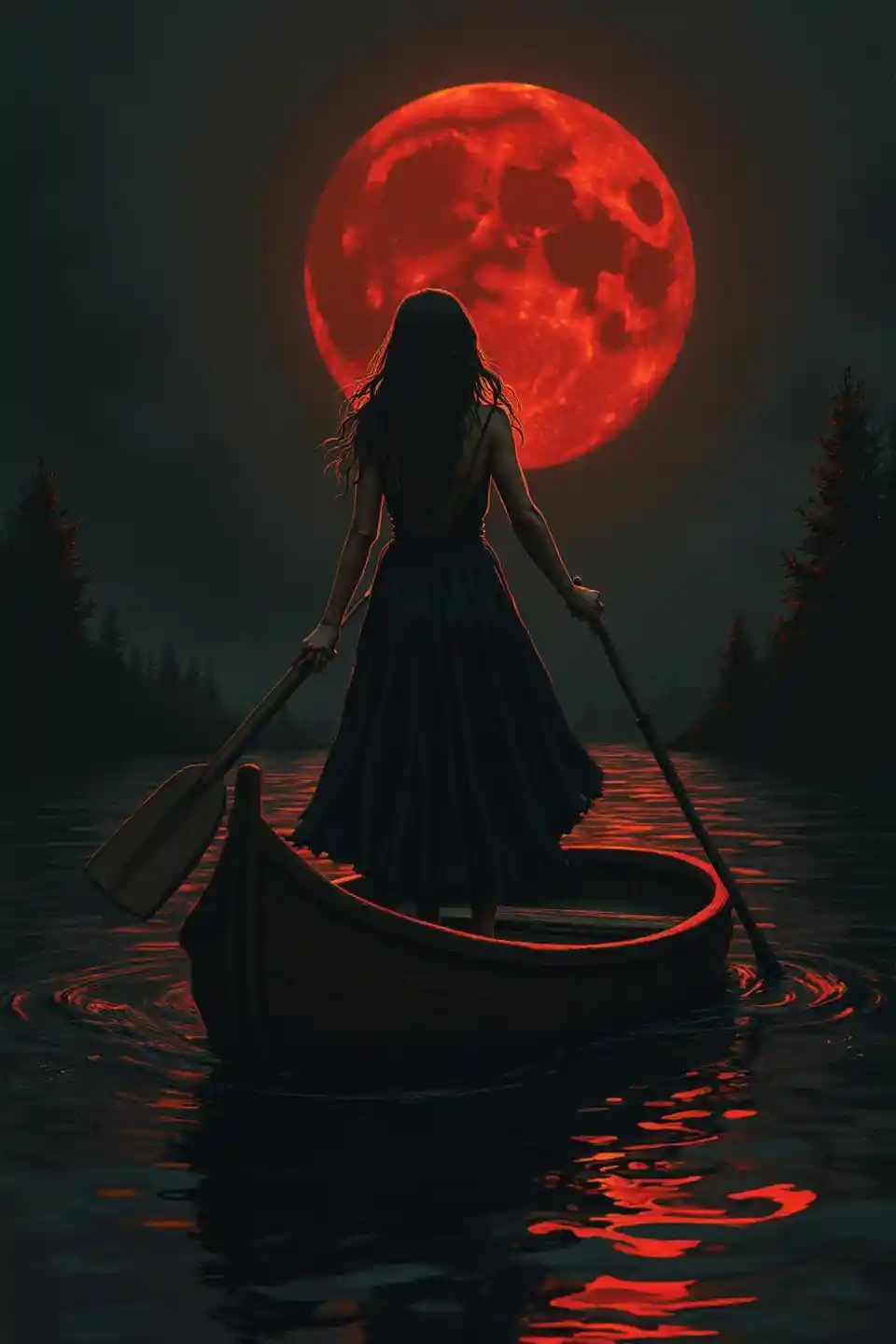 SkylarLa femme en robe noire rame à deux mains sur un bateau en bois, la lune rouge monte, le ciel nocturne, l'eau noire, une rivière, un squelette a plusieurs mains