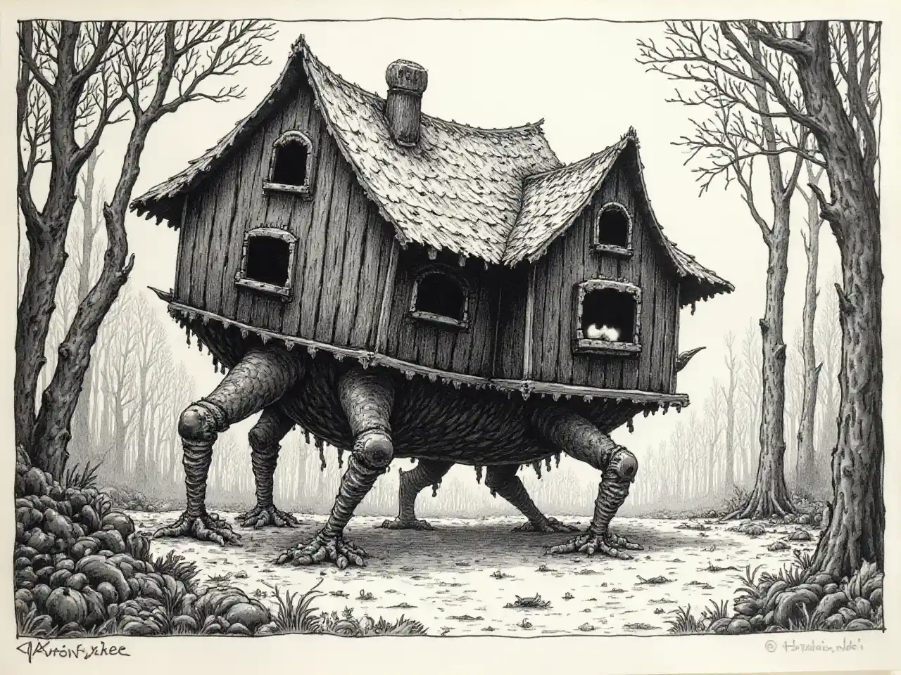 Des pattes d'oiseau laides géantes soutiennent une baraque en bois biomorphologique comme une œuvre d'art de Tsutomu Nihei:: la menace du mal La héraldiste Baba Yaga et son chalet de pattes de poulet biomorphologique traversent la forêt, avec un pinceau et de l'encre Tsutomu Nihei