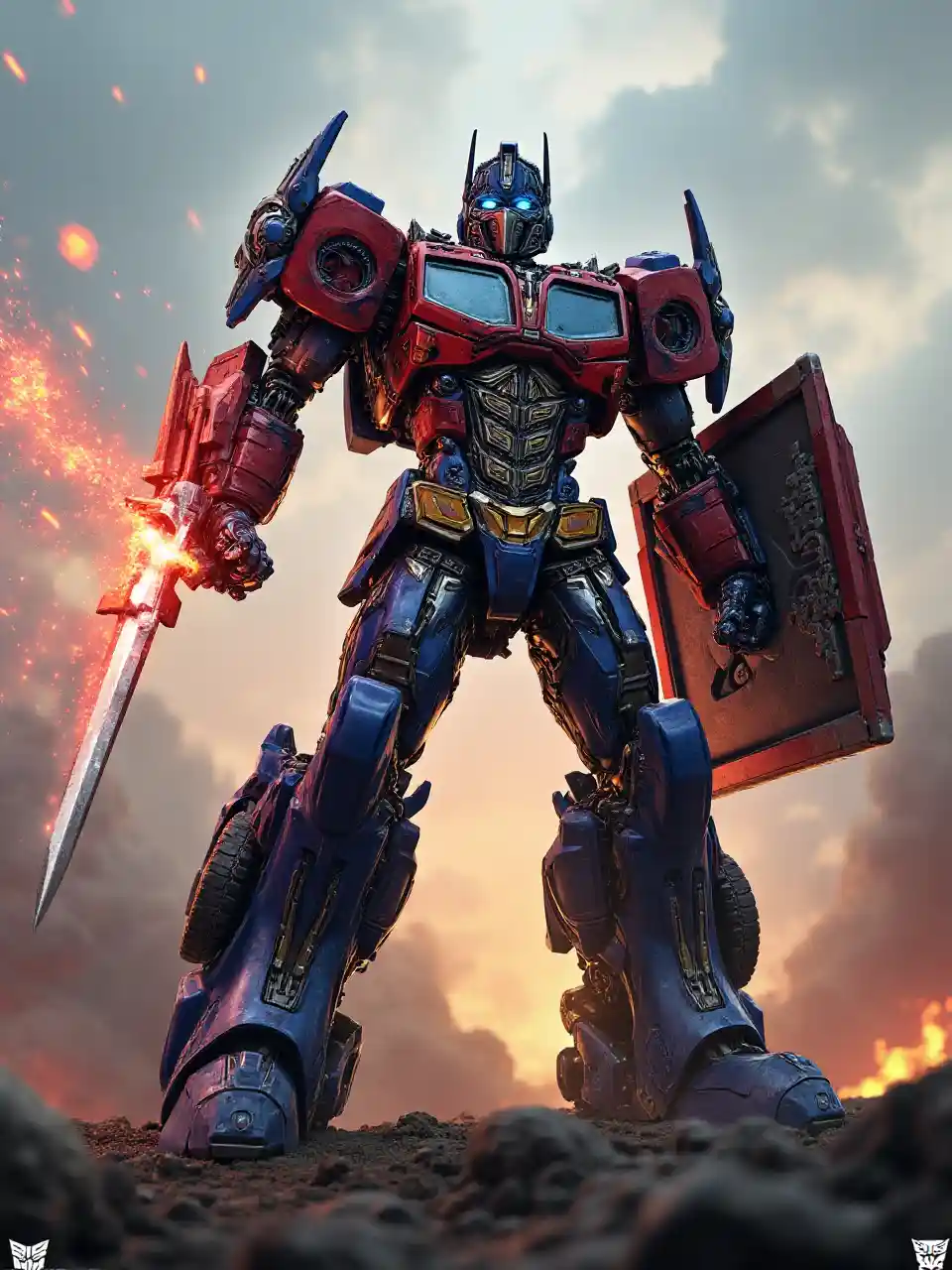 "A partir de Transformers: Age of Extinction, il a créé une représentation précise du chevalier Optimus Prime, montrant son armure de chevalier cybernétique détaillée avec des motifs complexes et son schéma de couleurs bleu-rouge emblématique. Il a brandi une énorme épée lumineuse dans une main et un énorme bouclier dans l'autre, posant dynamiquement dans une bataille acharnée. La scène capte l'essence de ses qualités héroïques, avec des étincelles, de la fumée et un fond de feu. Le design doit refléter fidèlement les détails de l'armure, les traits du visage et les armes et équipements vus dans le film. "