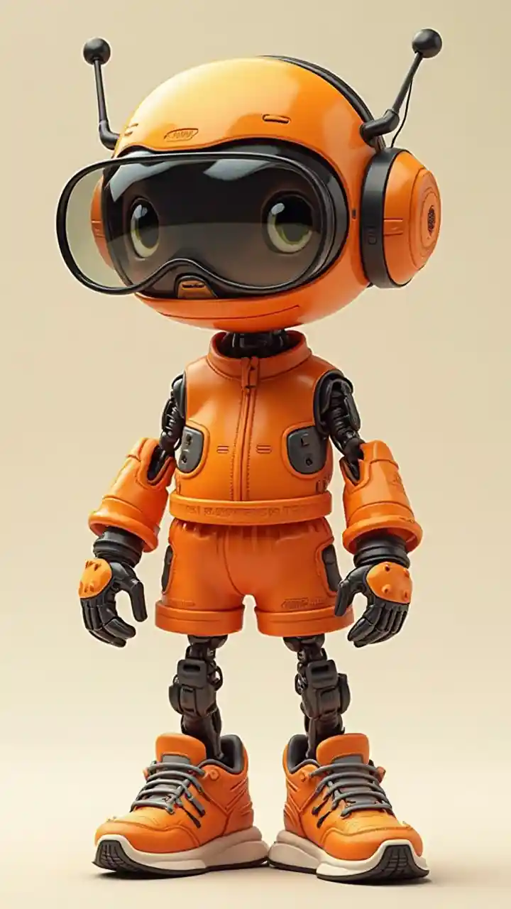 LukeLe robot au style mignon orange porte un survêtement futuriste à la mode, de grandes baskets et une paire de lunettes futuristes
