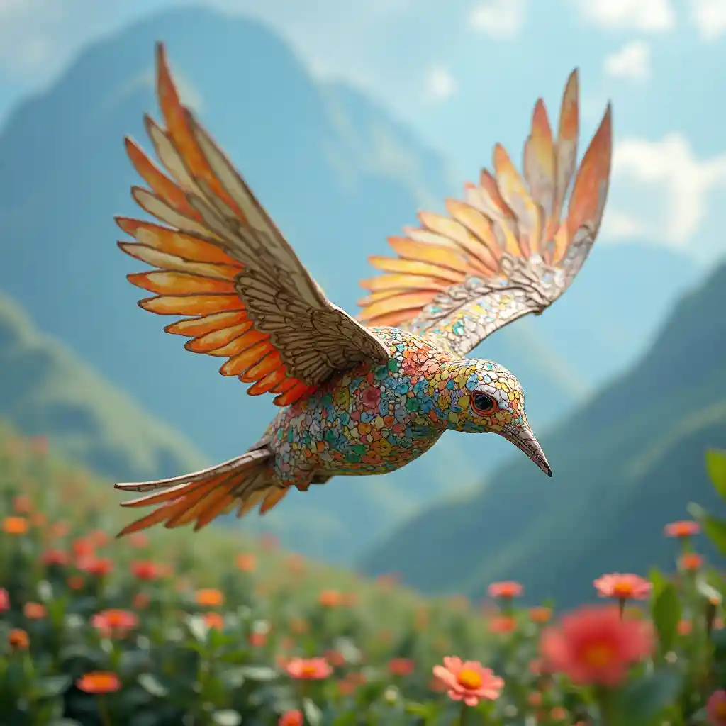 L'un ((((magnifique oiseau origami de couleur géante))), aux détails et motifs complexes, vole élégamment (((paysage de la nature)), étend son (((grandes ailes)), comme s'il avait aspiré de l'air frais, dégageant une sensation de liberté et de merveille