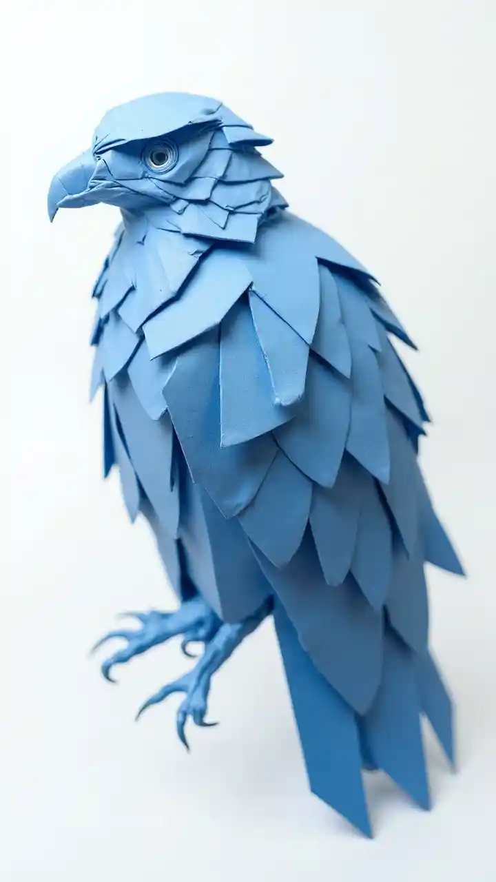 AutumnAigle origami; profil intégral; angle vers les 3/4; parallèle; hyperréaliste; fond blanc; bleu