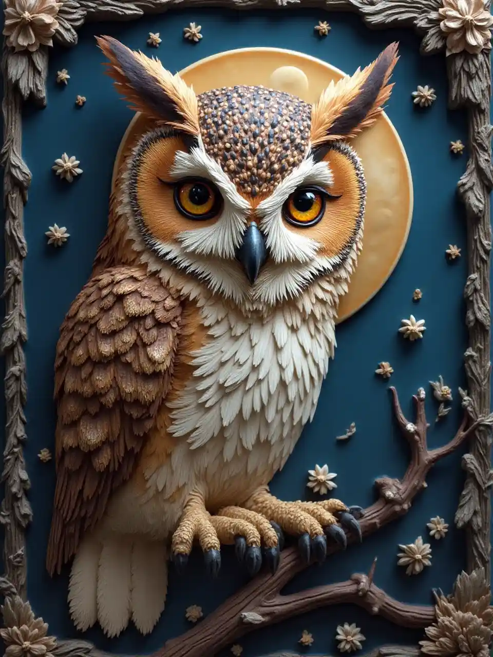 Imaginez un hibou en bas-relief 3D avec ses plumes aux détails complexes et aux textures réalistes. Ses yeux sages et perçants dominent la pièce. Palette de couleurs marron et blanc sur fond de ciel nocturne, avec un mystérieux bordereau clair de lune.