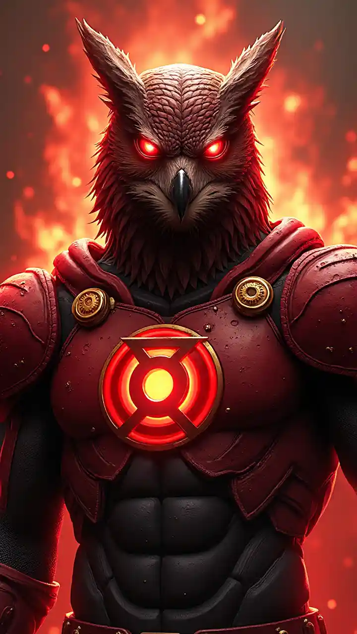 PeytonBague blindée hibou portant Sinestro Corp et lanterne rouge, entourée d'un halo rouge et jaune, lanterne rouge et logo Sinestro corp sur la poitrine
