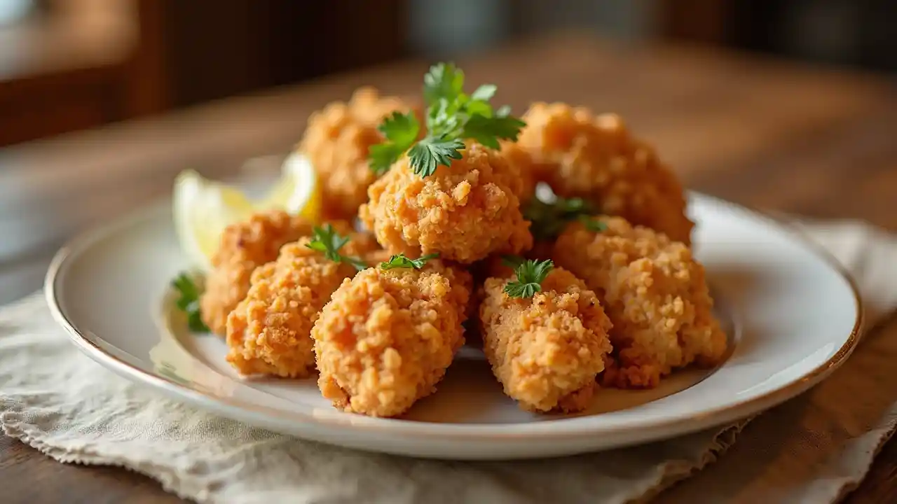 Une assiette de délicieuses photos marketing de poulet frit et d'huîtres pour un site de restaurant.