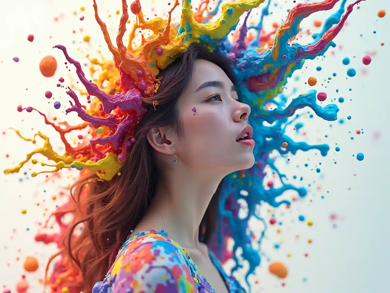 La photo du milieu, (différence de niveau: 1,8), (collision de peinture sur la toile), (profondeur de champ), 1girl face latérale y est intégrée, (face latérale), ouvrez la bouche, (cheveux arc-en-ciel de peinture liquide: 1,1) est faite de peinture, n'a pas peur de la gravité, coule épaisse, (éclaboussures de peinture: 1,3), liquide, magnifique, chef-d'œuvre, fond de détail, modèle de qualité d'image ultra-élevée, fond éthéré, beauté abstraite, volume explosif, peinture à l'huile, stylo lourd, lumière romantique, dispersion de sous-face, Objectif 135 mm, f1.8, lumineux, 8k, haute résolution, fantastique, lancer de rayons, hdr, rayons divins, fond blanc plat