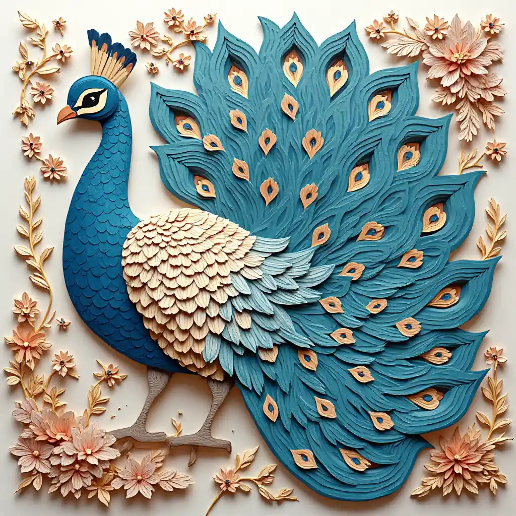Concevez un diagramme de style en couches découpé en papier d'un paon. Les paons sont représentés en couches de papier découpé, créant une apparence faite à la main. Le fond comprend des motifs complexes et des motifs floraux. La fourrure du chat est rendue par une fine texture de papier, ses yeux sont brillants et expressifs. La composition globale est méticuleuse et artistique, se concentrant sur l'artisanat et la profondeur, très méticuleuse et tendance.