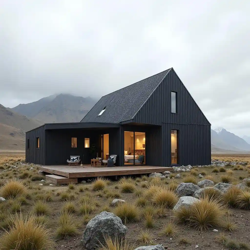 Vue de chalet sur le plateau de Patagonie. Conçu en 3 volumes, séparé par un jardin intérieur et relié par un couloir vitré. Destiné aux volumes de cuisine, de salle à manger et de lavoir, orienté vers l'est. Un rouleau destiné à la chambre, à la salle de bain et au dressing, orienté vers l'est. Un rouleau destiné au salon, orienté vers l'ouest. Et un quatrième volume indépendant, en deux niveaux, destiné aux studios d'architecture, face à l'ouest. Style contemporain, avec plafond incliné. Revêtement métallique en tôle ondulée noire