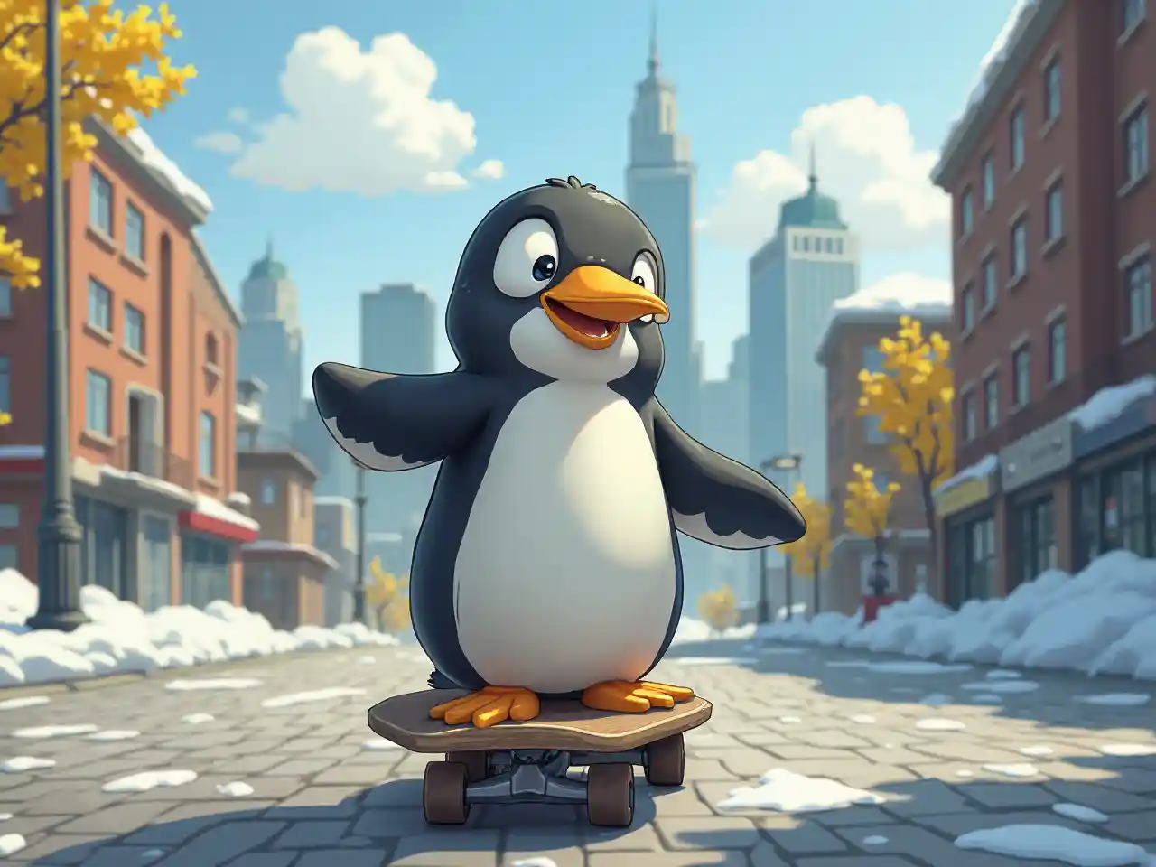 MaverickPortrait d'un manchot animé de dessin animé traversant Toronto sur une planche à roulettes