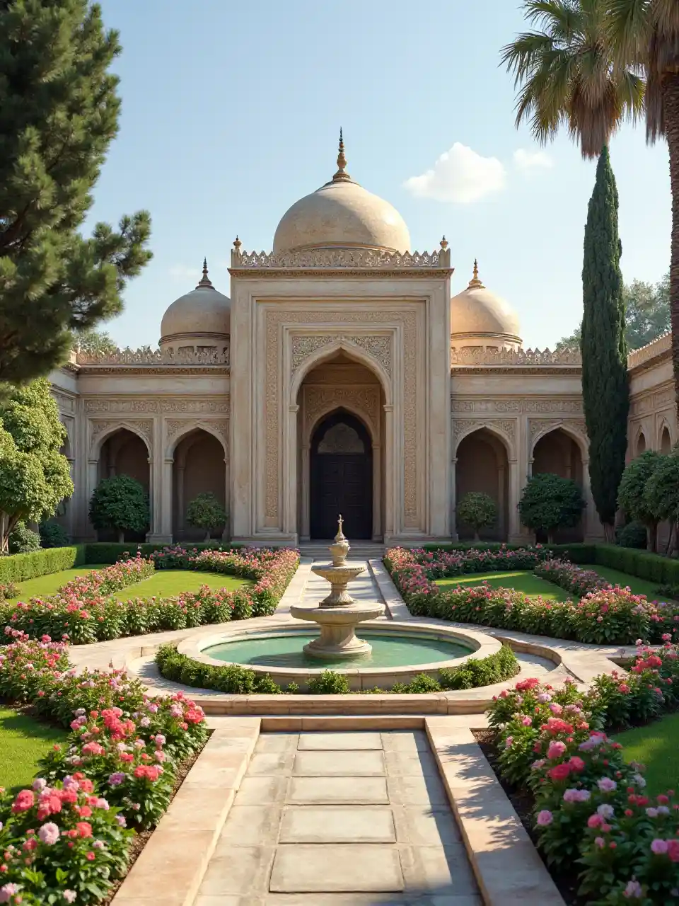 Vue extérieure du palais persan avec jardin de fleurs et fontaine au milieu